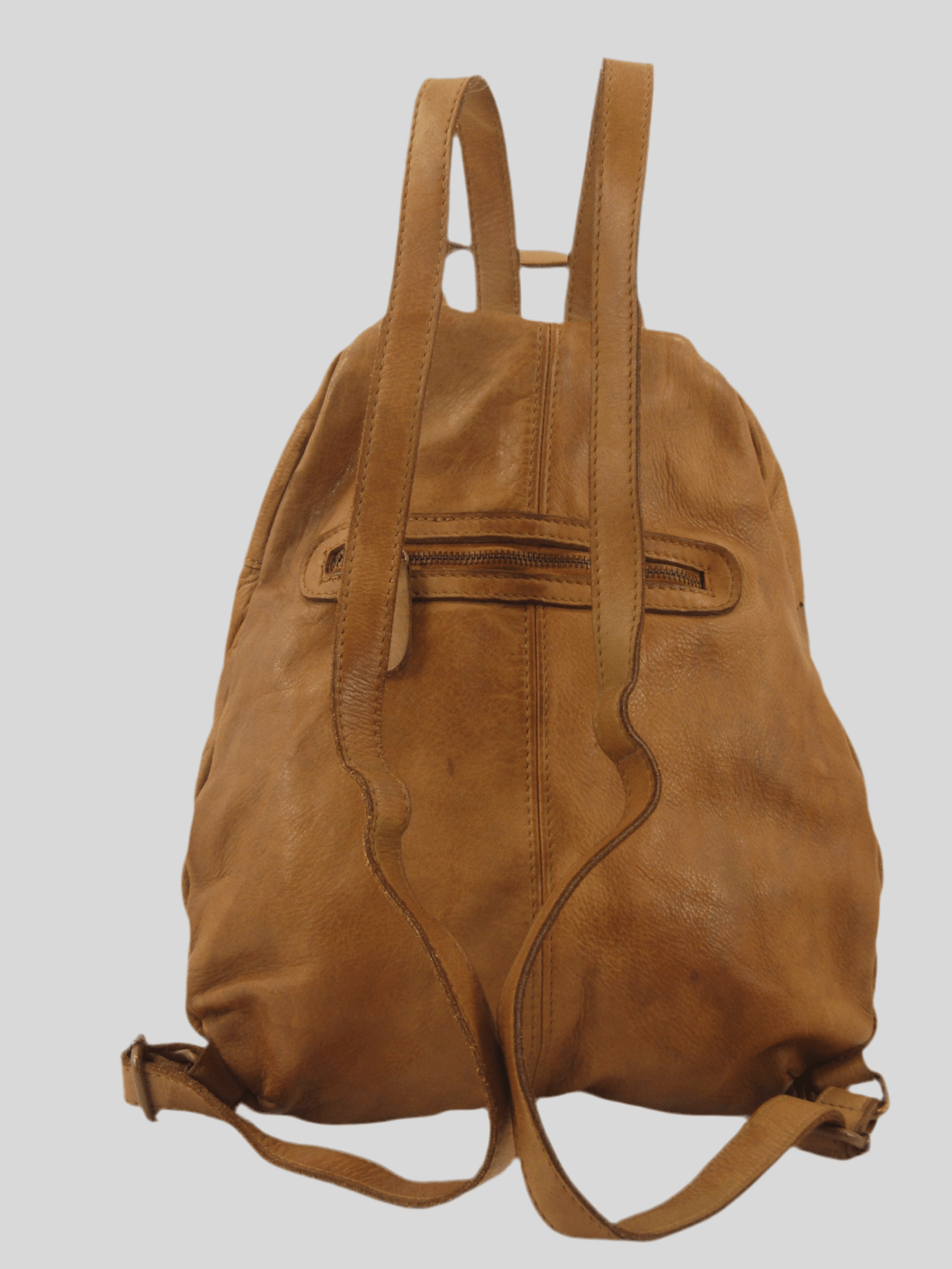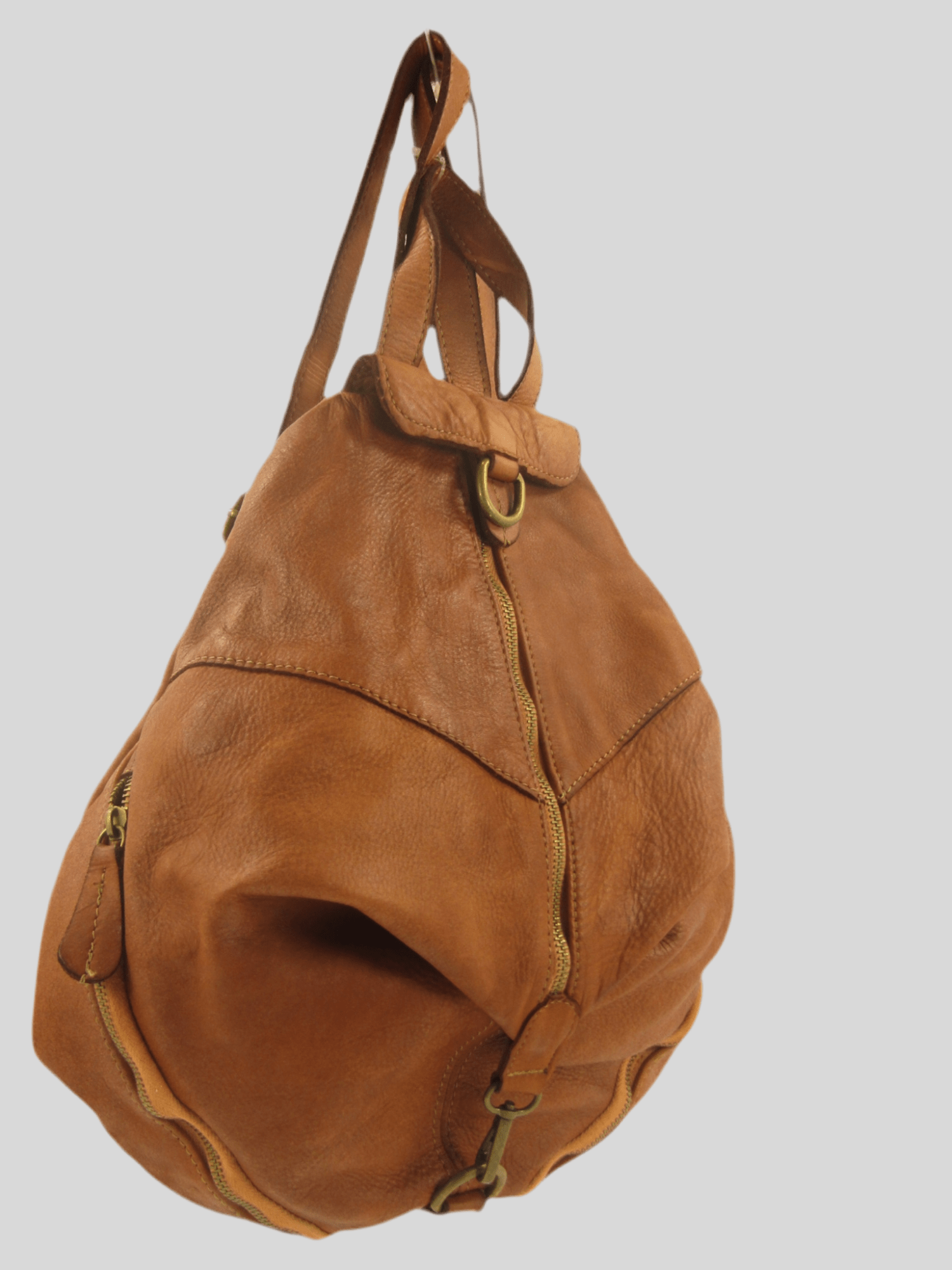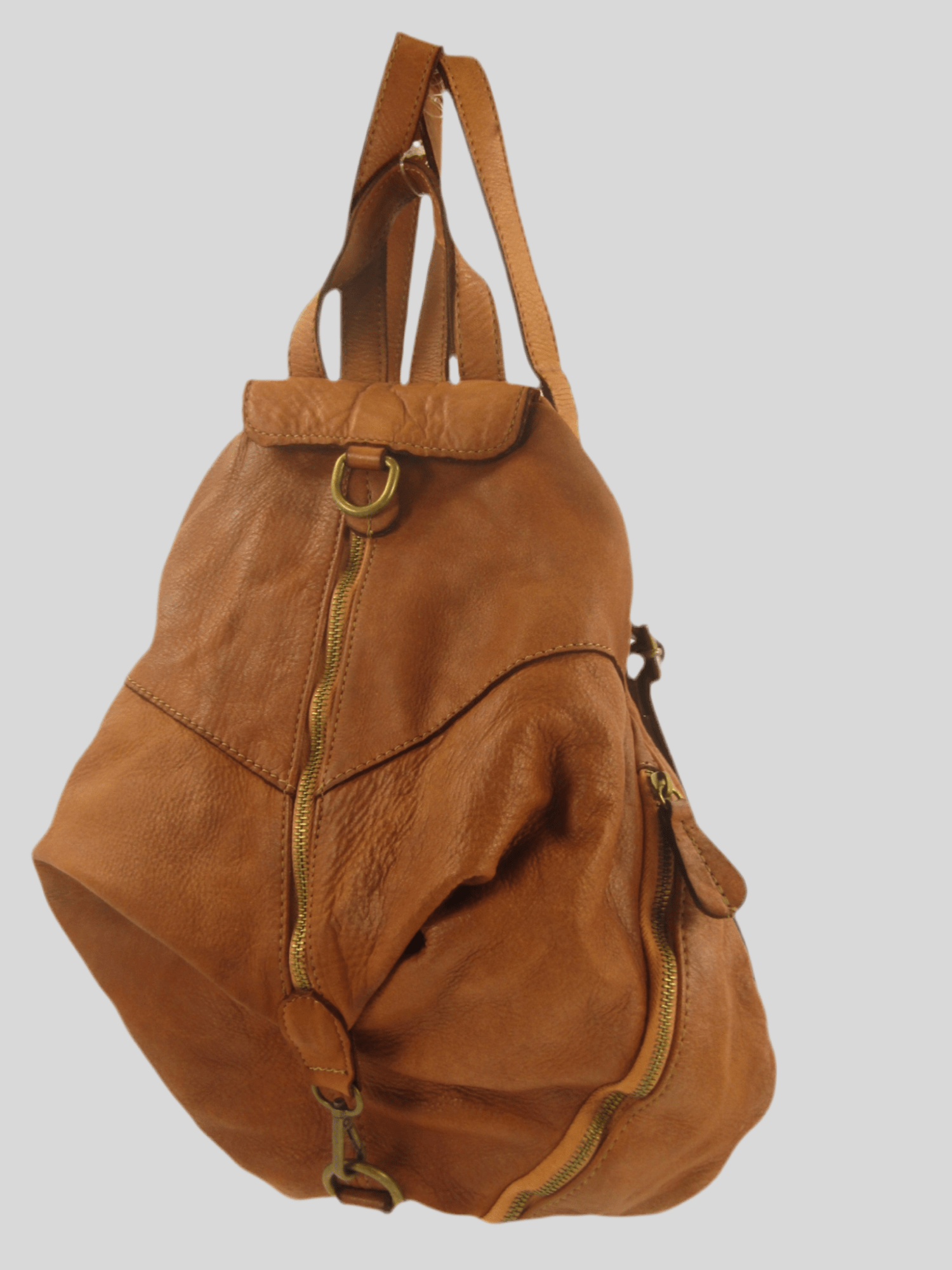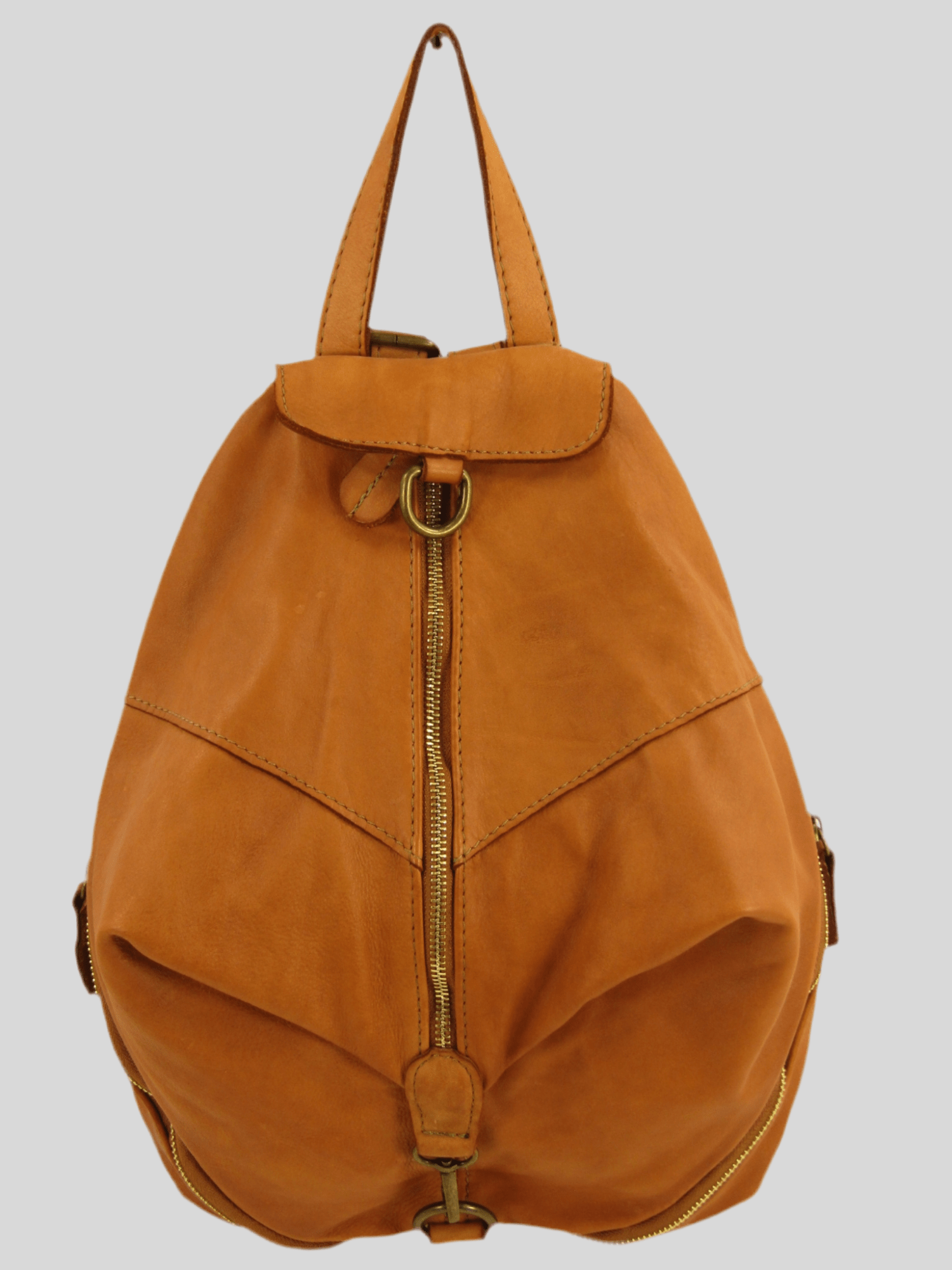 Zaino in pelle tinto in capo, chiusura con zip e moschettone, tracolle in pelle regolabili, interno rivestito accessoriato da tasca chiusa da zip e taschine porta accessori, sull’esterno frontale due tasche chiuse da zip, sul retro tasca chiusa da zip, zainetto accattivante nelle linee, caldo nei colori e morbido al tatto. Possibilità di chiuderlo in più modi agganciando o meno il moschettone.