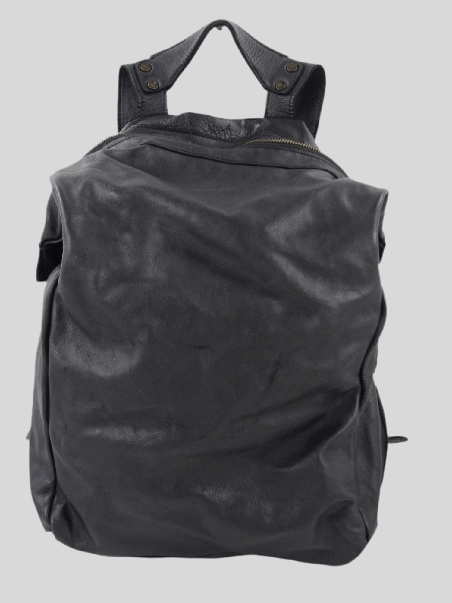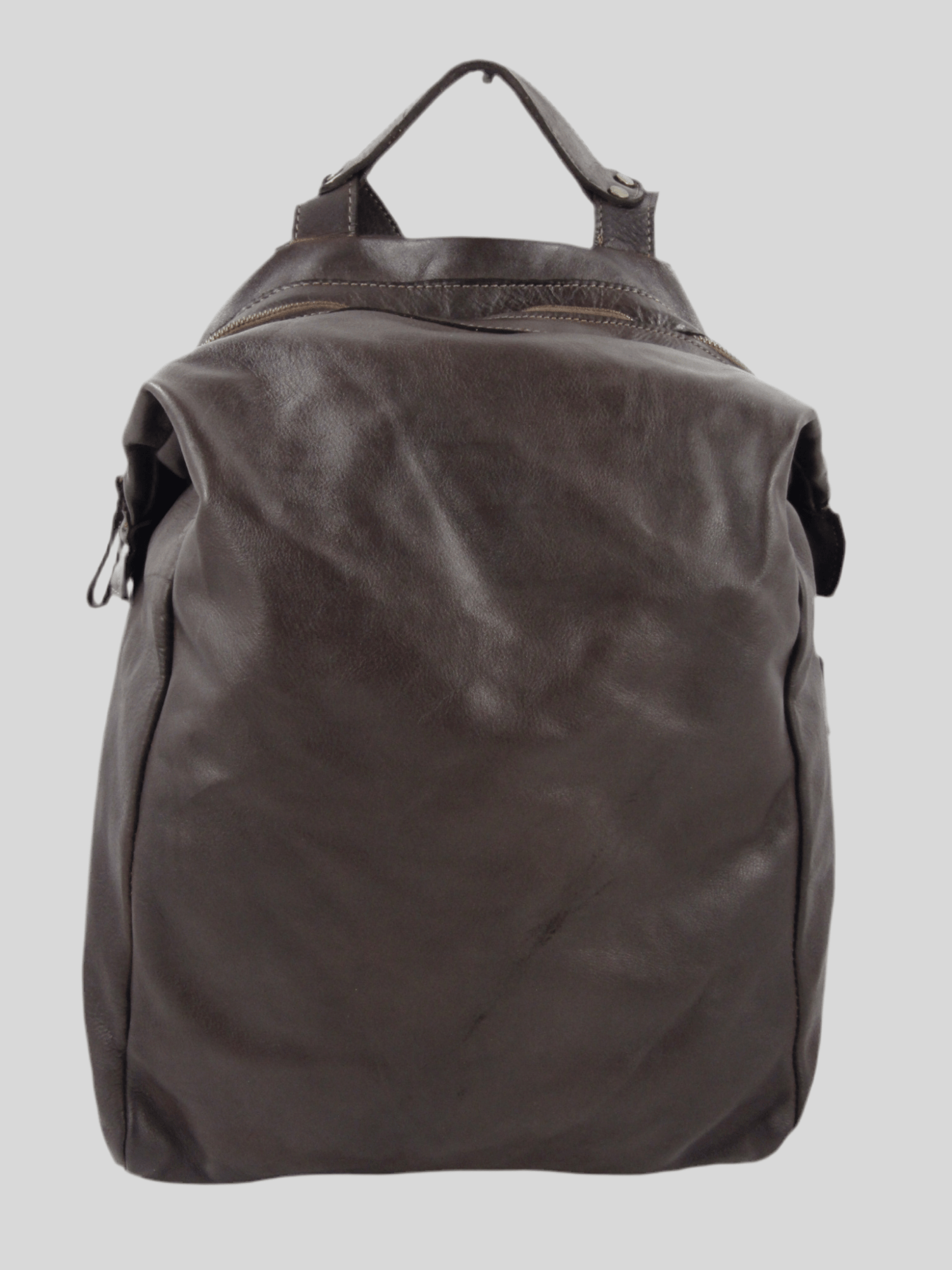 Zaino in pelle tinto in capo, capiente e morbido, chiuso con zip, interno unico scomparto rivestito ed accessoriato con tasca chiusa da zip e tasca di cortesia aperta, sull'esterno tasca laterale chiusa da zip, originale e comodo il manico ricavato fra gli spallacci, costruito in Toscana con pellami di alta qualità